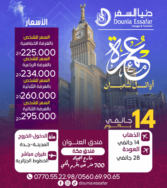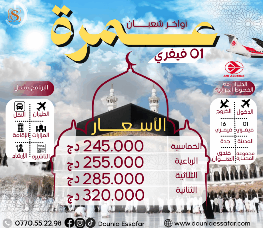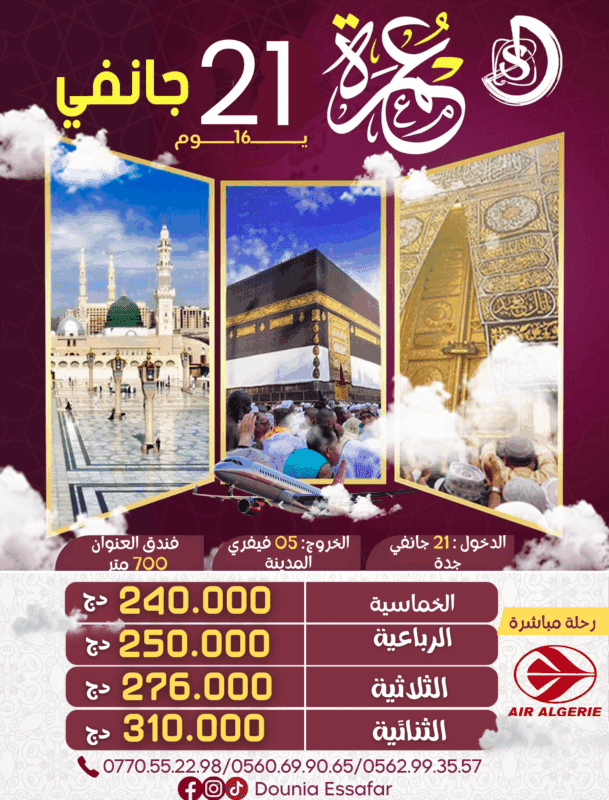 durée : 16 jours/ 15 nuits hébergement : hotel a makkah Aleunwan AJyad 700m. Medinah – Jed...